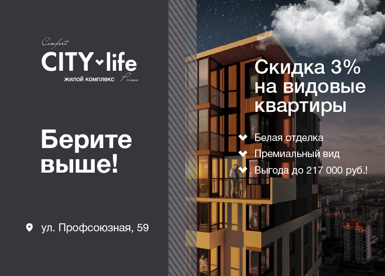 Только до 31 января 2022 г. скидка 3% на видовые квартиры в ЖК City Life (ул. Профсоюзная, 59). Выгода до 217 000 рублей. Премиальные виды открываются из окон квартир с 14 по 22 этаж. На выбор двух- и трехкомнатные квартиры европейской и классической планировки площадью от 45 до 64 кв. м. Все квартиры выходят на ул. Профсоюзную. Кроме этого, можно приобрести многокомнатные квартиры с видом на три стороны света. Широкие балконы глубиной 1,5 м имеют витражное остекление, что позволяет с комфортом любоваться живописными закатами и красотой вечернего города. Скидка на покупку квартиры предоставляется при условии оформления сделки и полной оплаты до 31 января 2022 г. включительно*.