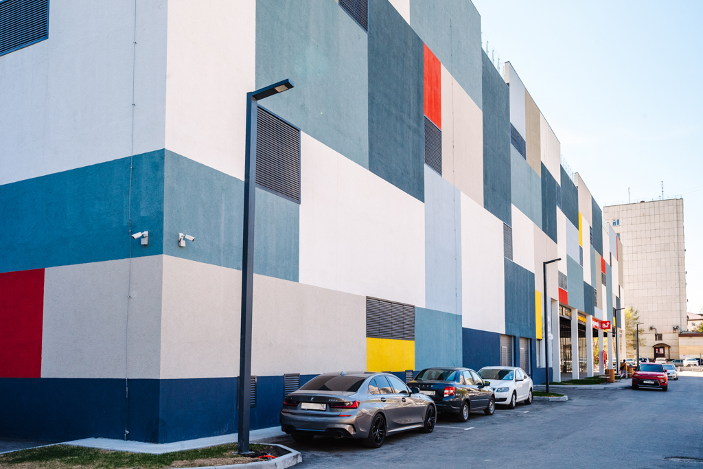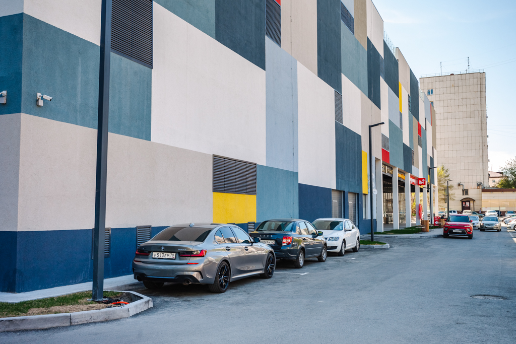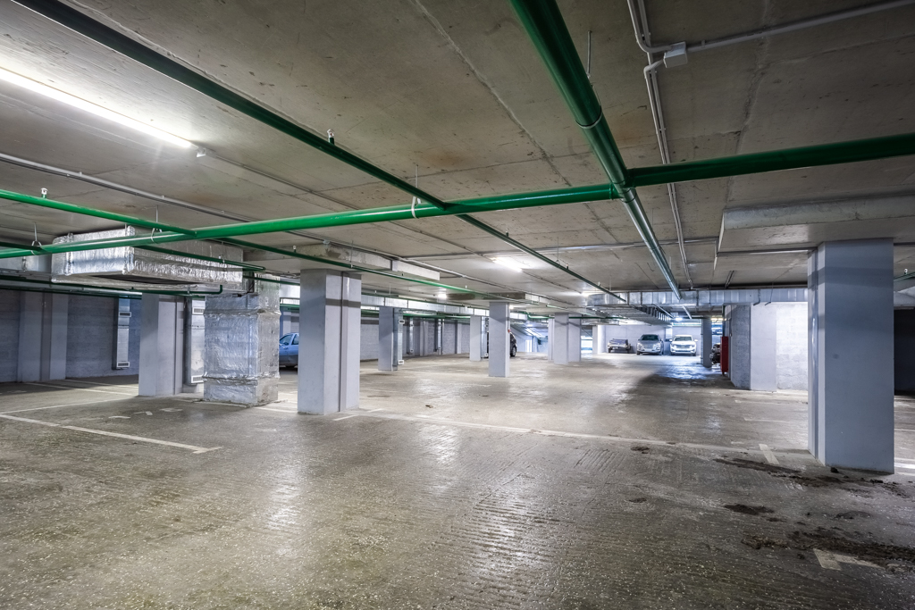 Всего в надземном закрытом многоуровневом паркинге 299 машино-мест, из которых 57 – «семейные». Размеры от 13 до 25 кв. м. Высота проезда 2,10 м. В паркинге есть лифт. Работает пост охраны, ведется видеонаблюдение.